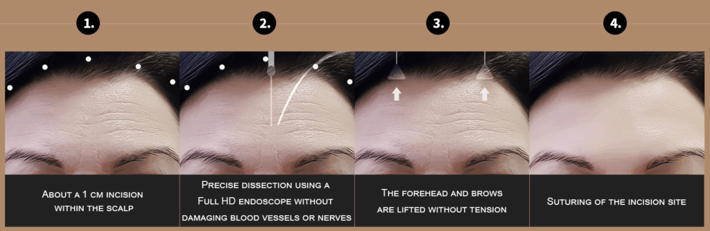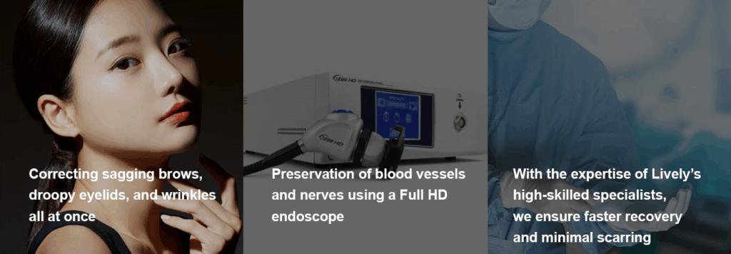 At Lively Plastic Surgery, our endoscopic forehead lift uses a Full HD endoscope to precisely identify and preserve important blood vessels and nerves, while weakening the muscles that pull the eyebrows downward. The forehead skin flap is lifted only to a tension-free degree and secured with Endotine. Endotine is gradually absorbed within about six months, providing a natural and long-lasting forehead lifting effect.