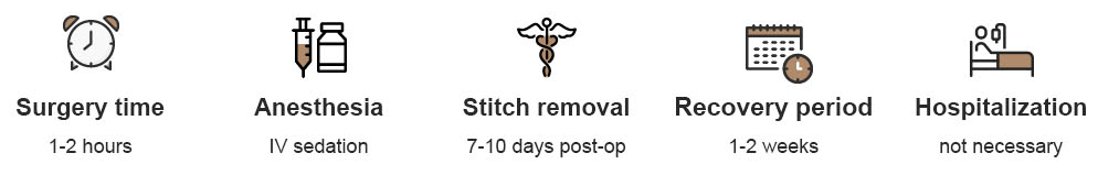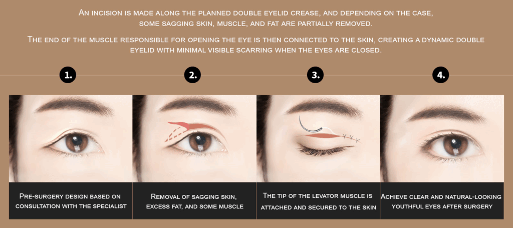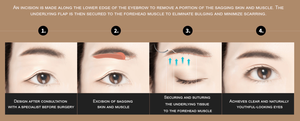 This procedure lifts only the sagging eyelid skin and soft tissue without altering your natural appearance. An incision is made along the lower edge of the eyebrow to remove the excess skin and muscle, then the underlying tissue is secured to the forehead muscle to eliminate bulging and minimize scarring.
