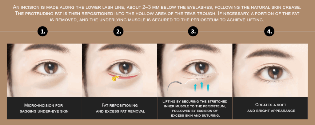With aging, the skin, muscles, and other tissues around the lower eyelids become thinner and lose elasticity, causing the under-eye fat to protrude. As a result, the underlying bony structure becomes more visible, and the tear trough appears sunken.